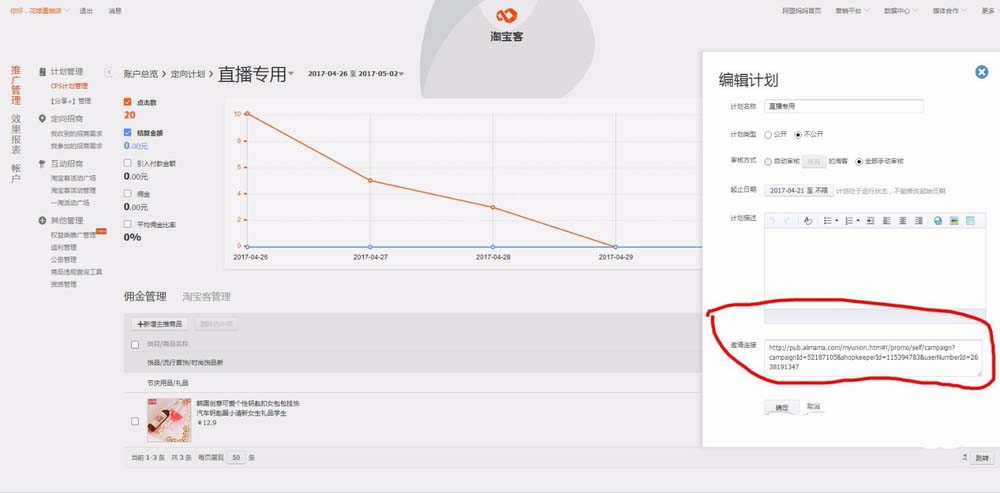 大家按照搜一客网小编介绍的方法,将设置好的计划链接复制一下,发给指定的淘宝客,淘宝客就能查看该淘宝客定向计划的全部信息啦。同时,小编还介绍了卖家如何设置定向计划的问题,大家在设置的时候,可以将佣金设得略高一些,以吸引淘客。