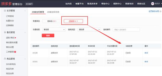 拼多多虚假发货违规投诉流程,我们可以在商家后台看到违规信息-店铺管理-违规信息。