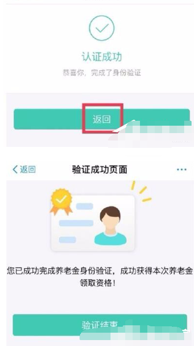 6、人脸识别认证成功后,点击返回,看到养老金身份认证成功页面,你就获得本次养老金领取资格。