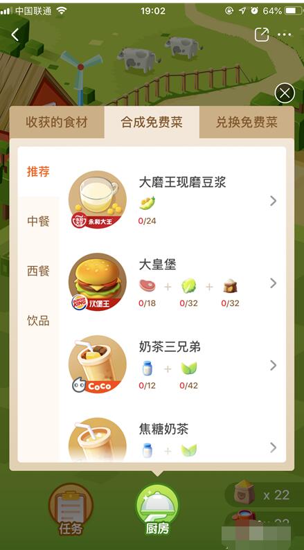 2、用户在收集够了某一个食物所需要的原材料之后,点击选择“厨房”按钮,就可以操作合成免费菜了,当然也可以去厨房看看食物需要哪些原材料。如下图所示: