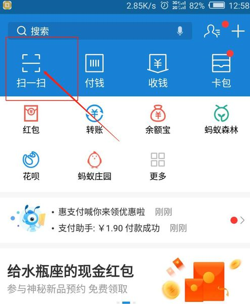 有了红包我们就该去支付了,可以去实体店超市扫店家支付宝收款码支付;还可以扫描自己手机相册保存的别人收款码实现支付。如图在首页左上方点击“扫一扫”,若是去超市扫描直接扫完就到了付款界面,输入金额付款即能自动抵扣。