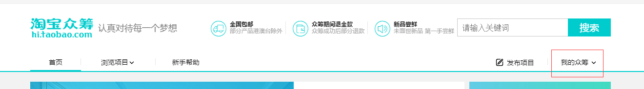 第一步,首先我们要进入淘宝众筹的首页,放在右上方的【我的众筹】;