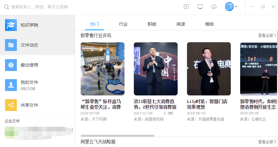 首先我们来说一下知识学院。顾名思义我们可以在里面看到最新的新零售行业资讯,还有千牛的头条,行业动态等。还可以看不同行业的资讯,例如物流行业、金融行业等。还有职业发展、管理方法等等。总而言之还是很丰富的,值得每天去看一看。