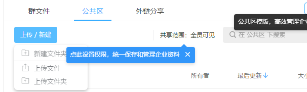 最后就是企业文件了,企业文件分为群文件、公共区和外链分享三个模块。