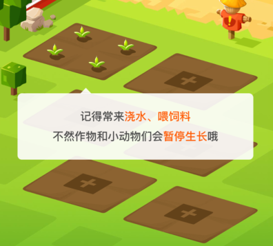 进入口碑农场呢,我们会发现,第一次进入的时候会送您一些水还有饲料,如果不给农作物浇水或者不给动物吃饲料的话,就会停止生长,所以一定要记得按时照顾自己的农作物和小动物哦。