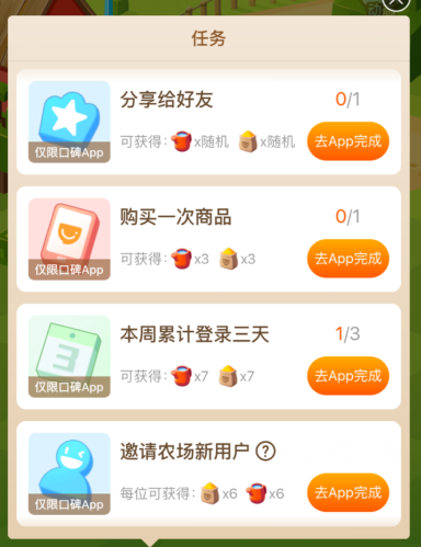 另外呢,虽然在支付宝也可以进入口碑农场,但是支付宝只可以领取每日的登录奖励获取水和饲料,如要要做其他的任务获取水还有饲料例如分享给好友、购买一次商品等任务的话还是要在口碑的app才可以哦。