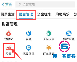 然后找找到页面中的【财富管理】就可以看到【股票】的图标了。只要点击进入;