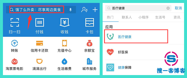 首先我们要登录上您的支付宝账号进入主页点击搜索框输入医疗健康就可以看到这个小应用了,如图所示点击进入;