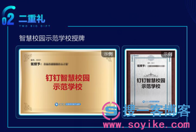 还有就是报名参加以后,就能够获得钉钉授予的智慧校园的智慧校园示范学校授牌,如图所示: