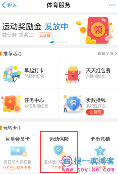 首先想要领取运动保障计划的话,登录到支付宝进入到体育服务,然后在页面的下方就能够看到玩转卡币一栏的运动保险啦,如图所示:
