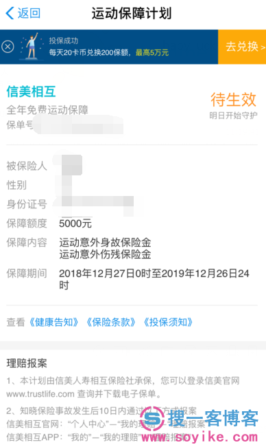 点击确认后就能够看到我们已经加入到了运动保障计划啦,处于待生效的状态。要在您申请的第二天才会开始生效,并且保障的时间只有1年。
