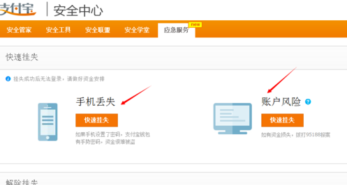 这时马上就会弹出两个挂失的页面,如下图所示,分别是是“手机丢失”和“账户风险”,这时你就可以根据自己的实际情况选择相应的挂失方法。