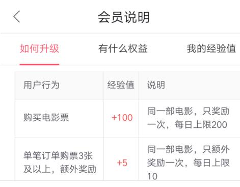 4、另外购买电影票可以获得100经验,首次设置头像和昵称得到5经验,写影评和受到别人的赞赏都可以获得10经验等等。具体如下图所示