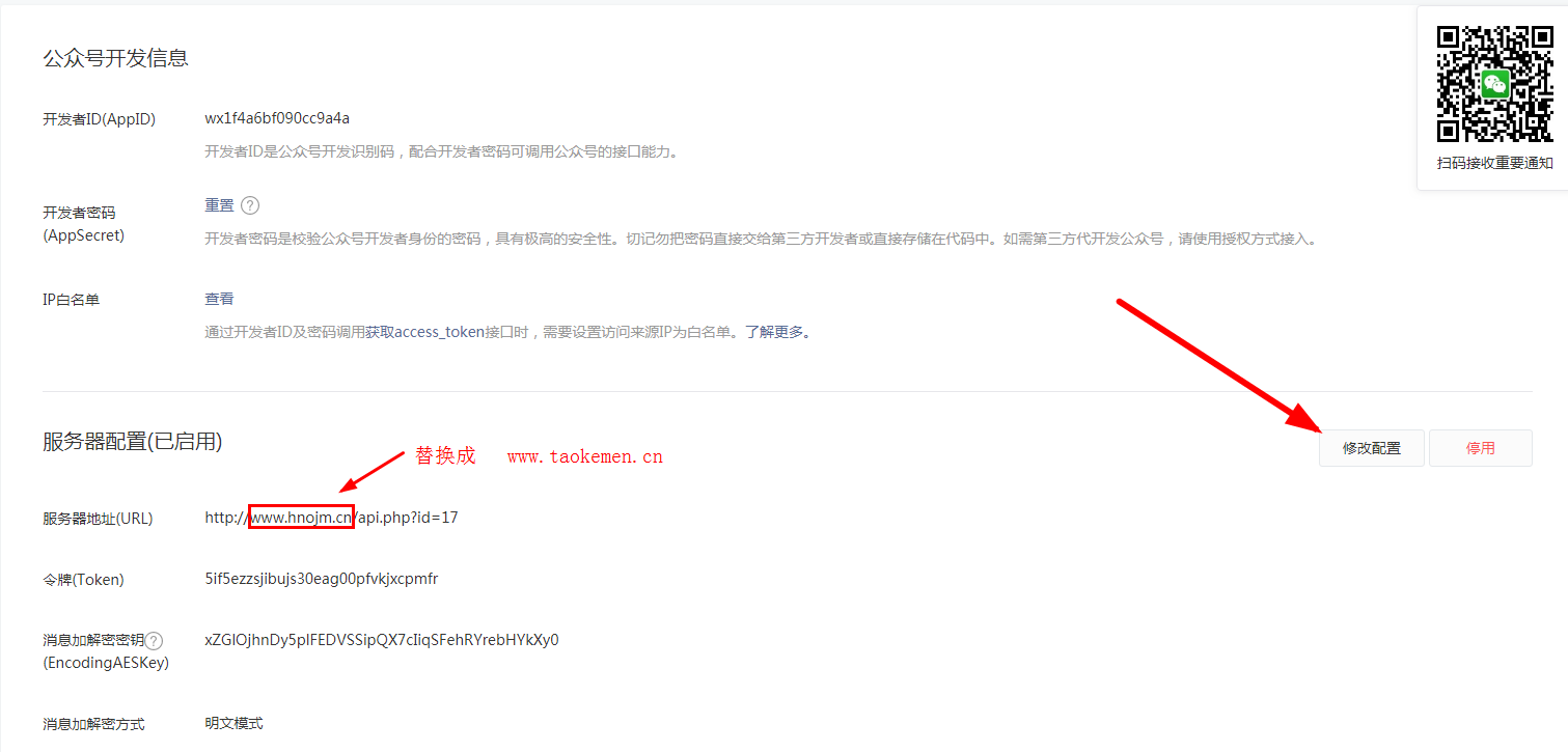 点击公众号设置——功能设置 里面三个同样的www.hnojm.cn 替换 www.taokemen.cn