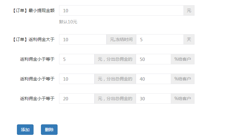 以图上为例,单笔订单如果总佣金是100元,设置的返利比例是30%,那么用户的返利佣金就是:100×30%=30元。图上设置的是佣金大于10元冻结5天,那么在用户确认收货后,这30的佣金会冻结5天后才会进入可提现余额进行提现。此功能主要是用于防止被人薅羊毛。
