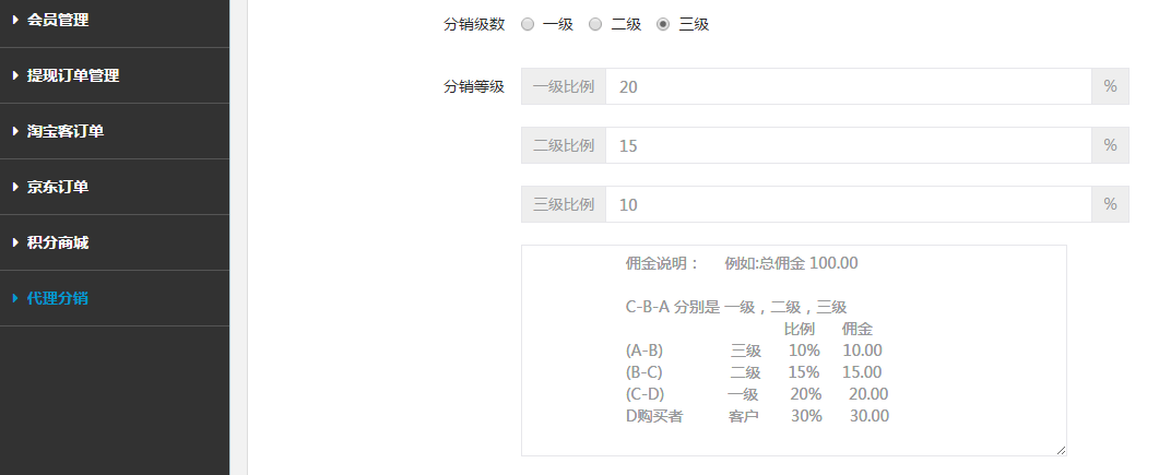 总佣金 100.00,默认设置的返利比例为30%,分销比例为:20%,15%,10%