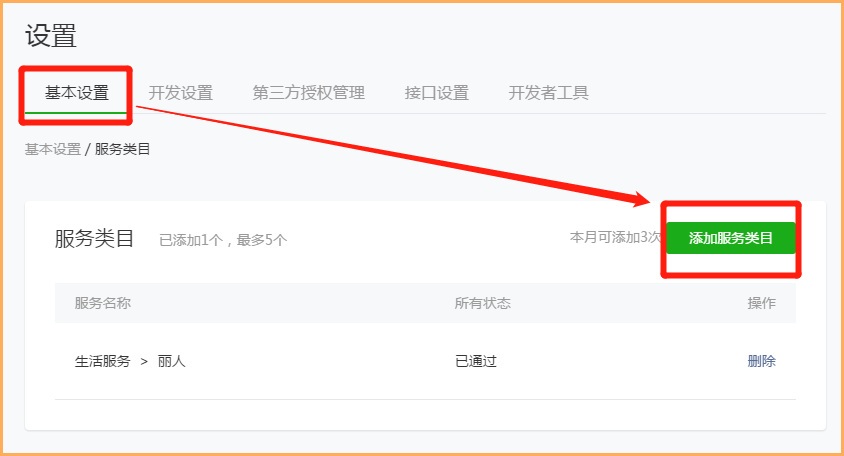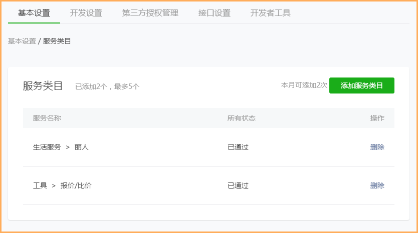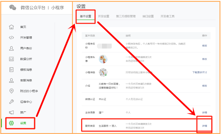 当官网提示您的小程序服务类目出现错误的时候,请按照以下流程操作。 请先登录:https://mp.weixin.qq.com 第一步,进入小程序后台:点击设置---基本设置---服务类目---详情。 第二步,点击添加服务类目 第三步,扫码后填写服务类目,并点击提交。 服务类目必须填写2个: 生活服务---丽人 工具---比价/报价 (少一个都无法提交微信审核!!!) 第四步,请务必填写以下两个服务类目!!!不然您的淘宝客小程序将无法正常开发和提审。