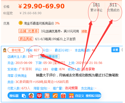 从图中可以看到,这个产品是3.21上架的,月销量是827,其中交易成功数是511,评价数是181,这就可以得到几个数据,上新时间短,近15天真实销量约300多笔,评价数是181说明这个产品补单的一个情况可能就是150笔以下,因为现在大多数的真实买家都不会去评价,都是15天自动确认收货,这个产品就比较符合我们的一个选品标准;阶段刚好是起飞的一个阶段,我们这个时候可以选这个品进行操作,当然月销量—交易成功数,他们的差距越大说明这个产品越好,我们操作成功的概率是越大的。