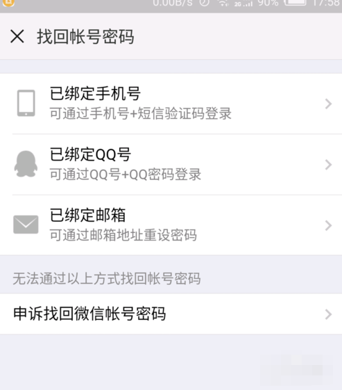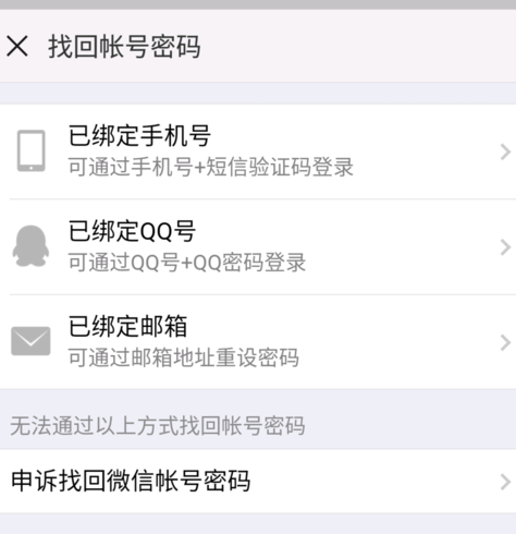 方法三:打开微信登录界面,输入帐号、密码,点击下方的“找回密码”,进入“找回帐号密码”界面,有三种找回方式,这里我们点击“已绑定邮箱”,填写绑定的邮箱地址,点击下一步,根据要求操作,即可解封、登录。