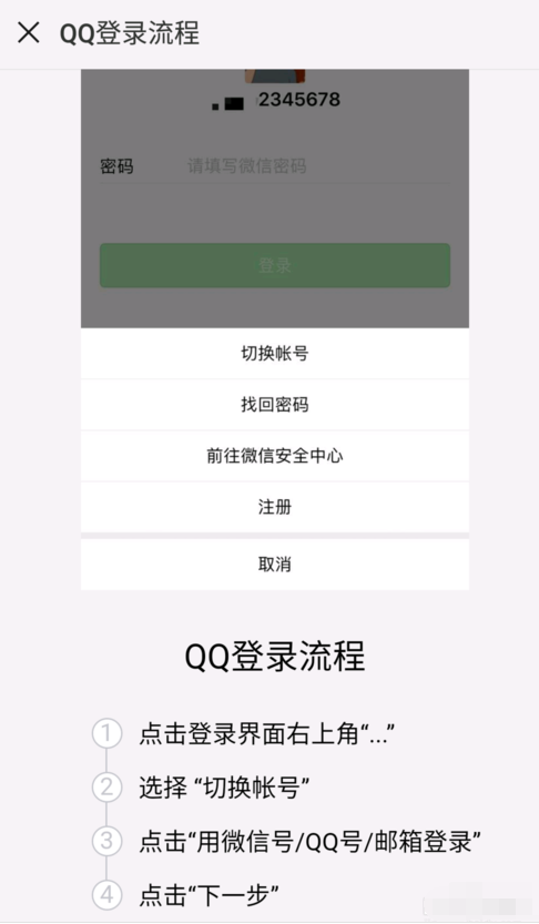 方法二:打开微信登录界面,输入帐号、密码,点击下方的“找回密码”,进入“找回帐号密码”界面,有三种找回方式,这里我们点击“已绑定QQ号”,回到登录界面点击“用微信号/QQ号/QQ邮箱登录”,点击下一步,通过QQ验证,该微信就解封了。