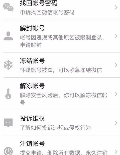 2、点击进入安全中心功能选项,在微信安全中心里面,大家可以看到找回密码,解封账号等选项,这时候依然将页面下翻到最底部,就可以看到一个注销账号选项了。如下图所示: