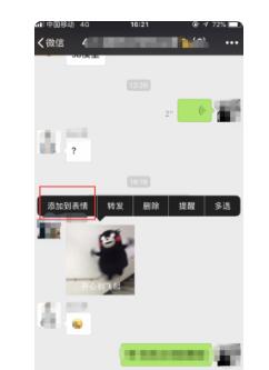 2、再上图中发现了一个比较好的表情,大家需要操作添加到自己的表情列表中,这时候大家需要进行的操作就是长按这个表情,然后就会出现上图中的功能选项,分别是添加到表情、转发、删除等等功能选项,这时候大家点击添加到表情的功能选项,就会成功的将此表情操作收藏添加了。