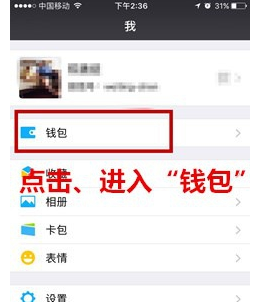 “我”的页面刷出来后,选择“钱包”一栏进入。