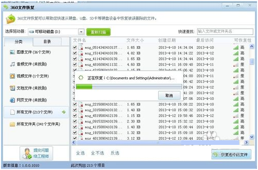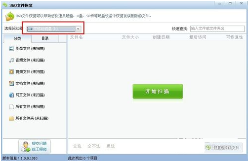 步骤二:用数据线将手机连接到电脑上,打开360安全卫士,找到360文件恢复工具,选择手机里面的可移动磁盘,点击“开始扫描”。