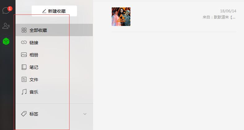 2、大家可以看到上图中左侧栏目里面分别有一个消息、通讯录和一个方形的图标存在,大家将鼠标放在这个方形的图标上,就会出现收藏的功能字样,这时候大家就需要点击这个图标进入到新的界面,如下图所示:
