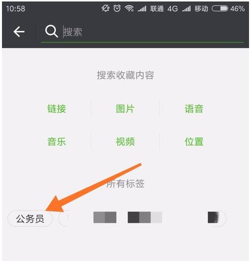 4、点击上图中的搜索符号之后,界面进入到微信收藏的搜索状态,在微信默认收藏分类的下方,大家就可以看到自己刚才编辑拟定的标签了。如下图所示: