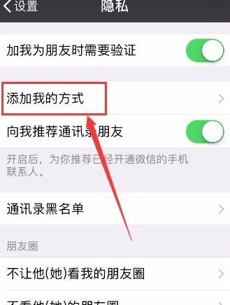 到隐私信息设置页面后,这个页面会有我们基本的隐私设置信息。而设置拒绝群聊的还需要我们点击添加我的方式菜单进入下一个页面。