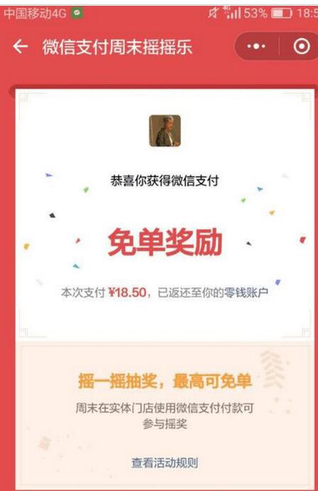 大家在现实生活中进行购物支付的时候,需要选择微信支付才可以参与此类活动,同时需要满足的条件是收款的商家也参与了此类活动,还进行了微信收款码的申领,而且只有周末参与此活动才能赢取免单的机会。当这些条件都满足的时候,大家在进行购物支付的时候,扫描了对方的收款码进行微信支付,在支付完成的界面会出现如下图的提示: