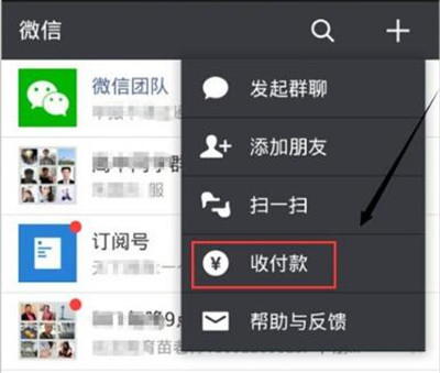 1、登录你的微信账号,点击在右上角“+”号,弹出菜单选择收付款。