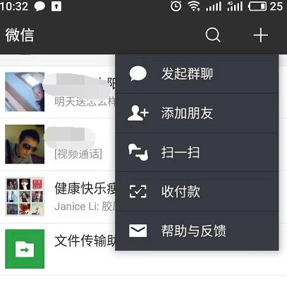 1、大家打开自己的手机微信端,进入到首页界面,在这个界面里面大家可以看到在右上角的位置有一个加号的符号选项,大家点击这个符号会出现以下功能列表,如下图所示: