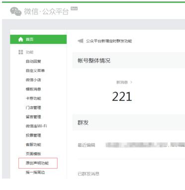 1、大家登陆微信公众号后台操作平台,进入界面后,在页面的左侧栏目中找到原创声明功能,如下图所示: