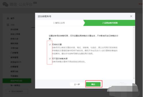4、这时候会有一个新的窗口出现,主要是对授权公众号的权限进行设置,目前有两种结果供大家选择,一是授权的公众号可以修改该授权文章的内容、格式、排版等等,二是授权的公众号在转载该原创文章时,文末将不会再显示转自某某公众号;大家根据自己的需求进行相应权限的选择和设置授权,勾选后之后点击确定即可,如下图所示: