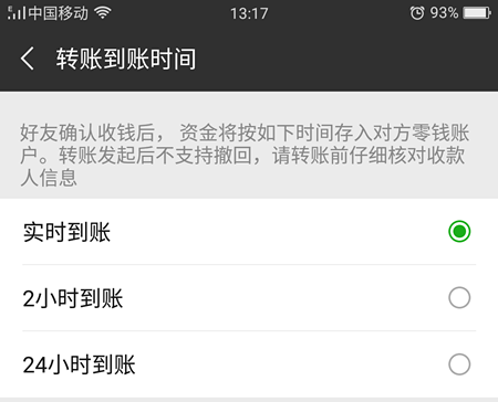 微信延时转账功能的设置如下:打开手机微信,点击屏幕右下角的“我”- “钱包”,进入微信“我的钱包”中,点击屏幕右上角的“四个小方框”图标,再点击进入“支付管理”,在 “转账到账时间”页面中,这里有“实时到账”、“2小时到账”、“24小时到账”三项,默认情况下是实时到账,我们可以把实时到账改为“2小时到账”,也可以设置成24小时到账的,直接点击前面的小圆圈就可以了。