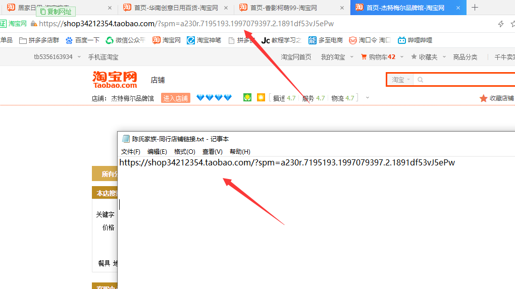 直接挨个点击,符合我们条件的同行店铺,挨个把店铺链接复制到文本里头!