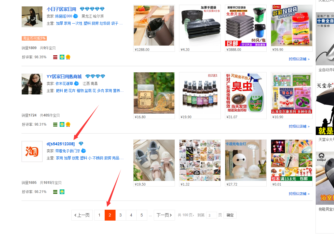 最下面还有翻页,第一页选完,就选第二页,每个关键词有 100 页的店铺数量