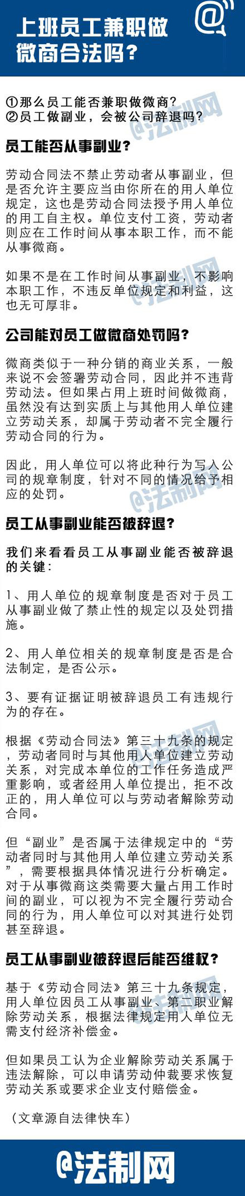 发现上班族全职员工兼职做微商合法吗? 身边做微商的朋友中,大部分人都有全职上班族。那么员工能否兼职做微商?员工做副业,会被公司辞退吗?员工从事副业能否被辞退的关键因素有哪些?员工从事副业被辞退后能否维权……详见↓