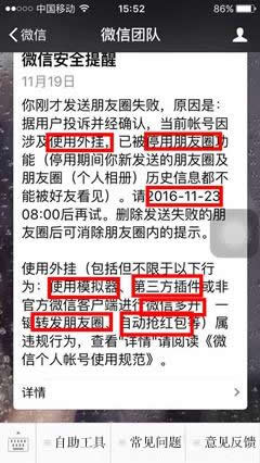 腾讯官方一直严厉打击转发小视频软件、红包外挂软件!据业内人士不完全统计,近段时间全国45万微信号被封、限制发朋友圈!其中使用一键转发小视频软件封号37万个,限制发朋友圈8万个!(以上封号数据均为统计后的大概数据)