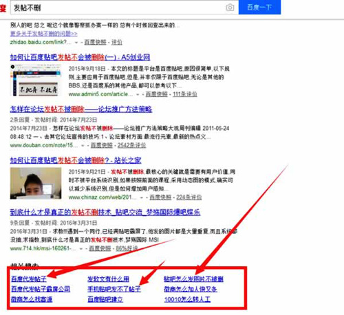 然后直接拉到最下面看到下面相关的搜索词出来!把这些词组合起来。就是一个新闻源标题!这类型的标题才是最容易被客户搜索到才是最精准的。一个新闻源的标题最好是三个搜索词组成的 比如:《贴吧发帖不删技术 贴吧发帖防删技巧 贴吧发帖小技巧》这类型的!