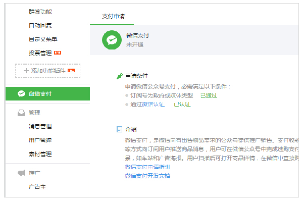 1、先登陆微信订阅号,然后在左侧找到微信支付这个功能,如下图,开通微信支付需要满足申请条件。