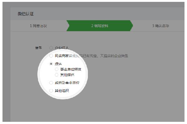 3、点击统一协议后,则需要填写资料,如下图,选择类型,是网店商家还是企业法人;是事业但媒体还是其他媒体;政府及事业单位;其他组织。另外有一点需注意的是现在的微信订阅号微信支付功能,仅限于媒体和政府机构,其他类型有待开放。