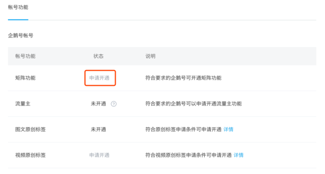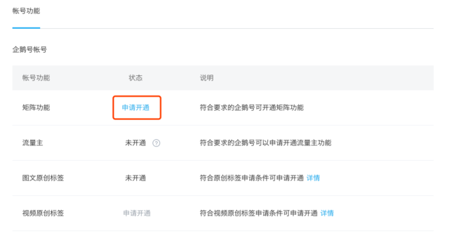 若当前登录的帐号企鹅号指数≥3000分,且是正式的企鹅号,则申请开通的文字为蓝色可点状态,点击后将进入矩阵功能申请界面。