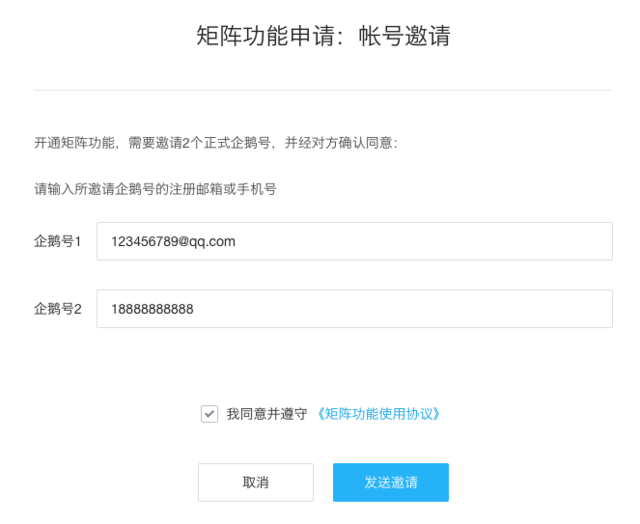 矩阵功能申请的第一步,需要填入两个拟邀请的正式企鹅号,同时勾选同意并遵守《矩阵功能使用协议》,点击发送邀请按钮。