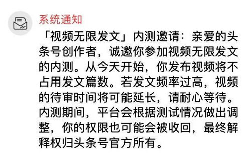 很多朋友都在玩头条号,主要以发视频为主。收入都很不错,为了多盈利,大家开了很多号,同时操作,自媒体经济俨然达到另外的一个高峰。但是多号操作也有一点麻烦,最近很多朋友都收到了一个消息,收到内测消息,发布的视频将不再占用发文篇数。什么意思呢?通俗的来讲,就是可以无限发视频,一天你可以发很多条视频内容。
