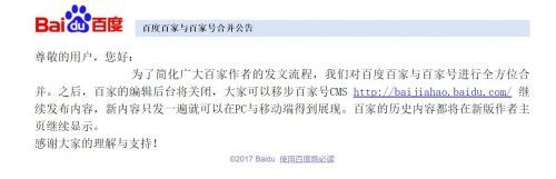 近日百度官方发布公告,为了简化广大百家作者的发文流程,我们对百度百家与百家号进行全方位合并。
