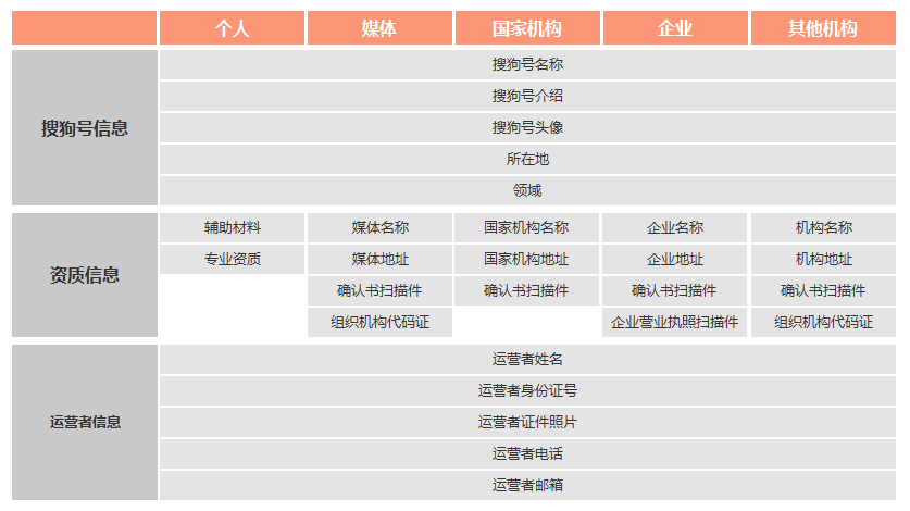 搜狗号目前已开通个人、媒体、国家机构、企业、其他机构五种类型账号的入驻通道,您可参考下述类型细则,选择账号入驻类型。