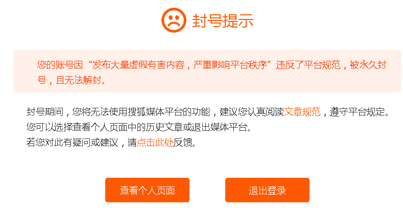 今天早上登录搜狐自媒体平台准备投稿,结果发现账号被永久封号。不仅仅再也无法发布文章,连同以前发布的所有文章都无法访问,全部进入404页面并跳转到官方指定页面。这对我来说影响挺大的,因为居然在不知不觉中被封锁账号,到底是哪篇文章出了问题我都不知道。好比一个人被莫名其妙的判了死刑,结果却不知道自己到底犯了什么罪。